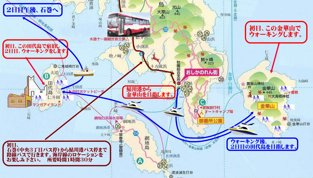 午前6:30スポーツショップ「マツムラ」前(集合)、午前6:59出発—<定期バス>—鮎川港午前8:20着—<定期船午前9:20発>—金華山着午前9:45着(ウォーキング、昼食など)—金華山発午後2:30頃発—<貸切り船、遊覧の予定>—田代島着午後3:15頃着(自由行動<釣りなど>、夕食、交流会、宿泊など)
