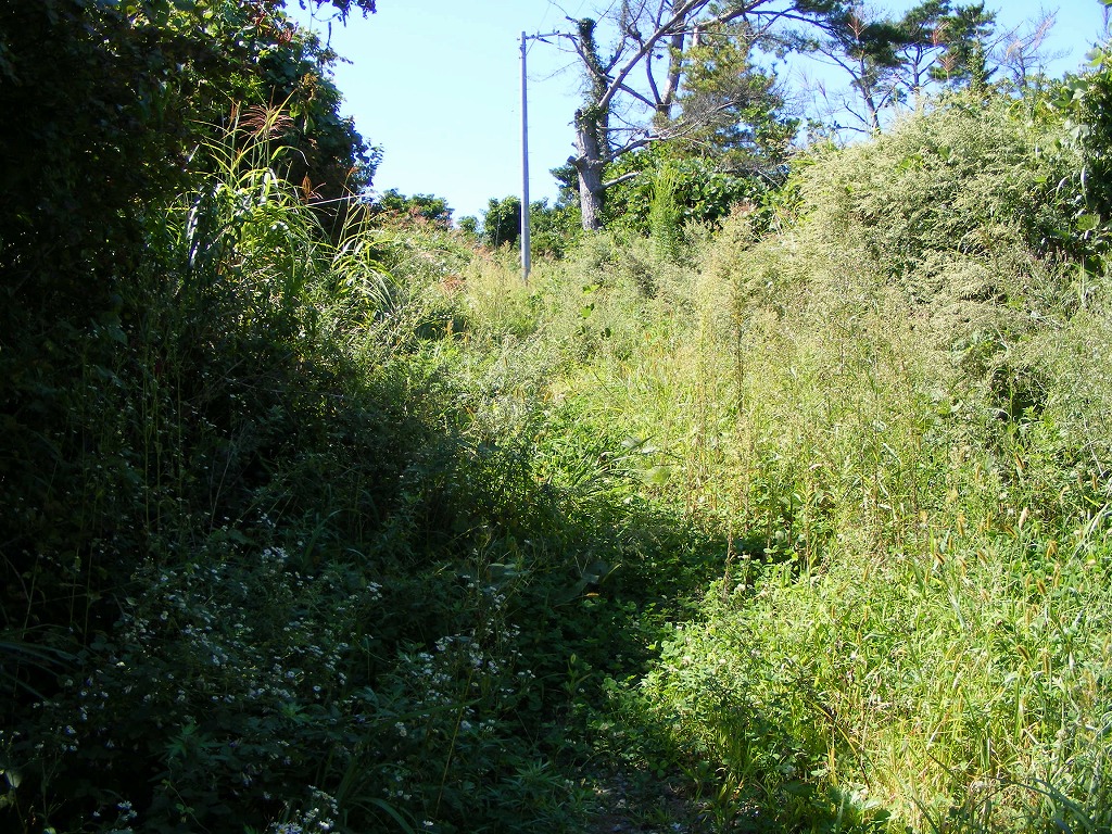 6 正島山から灯台目指すも背丈ほどの草が生い茂り、途中で断念(ここは唯一、砂利道で普段観光客が立ち入ってないと推測します)
