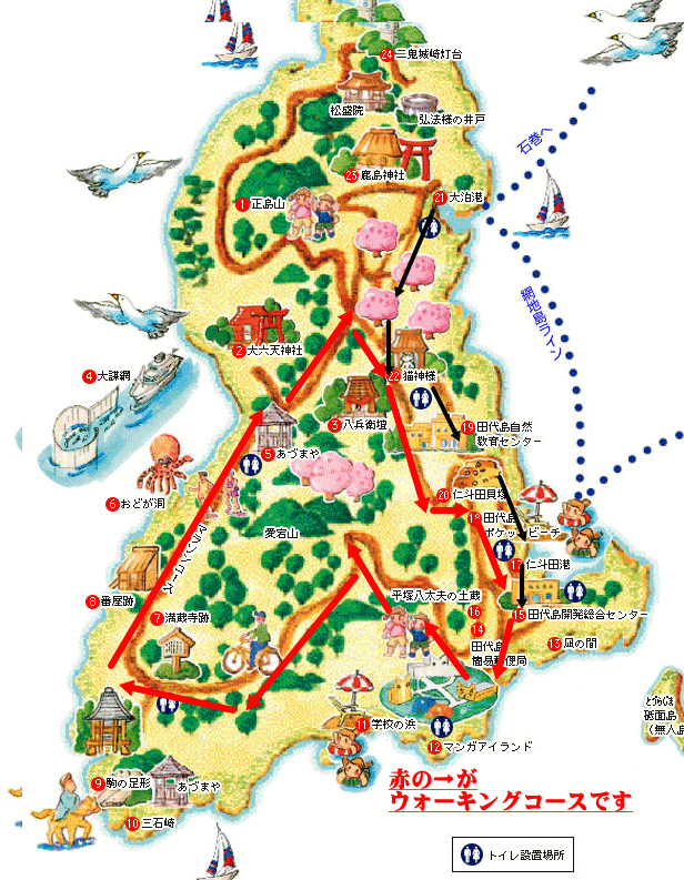 2島のウォーキングコース(予定)を掲載しました。 By island2014年9月18日上 ◆金華山 社務所(金華山神社)⇒山頂⇒社務所(金華山神社) *ウォーキングポール使用を推奨します。ポール無料貸出します。 ◆田代島(猫の写真撮影とウォーキングの選択など) 仁斗田港⇒マンガアイランド方面⇒番屋方面⇒大六天神社方面⇒猫神社⇒仁斗田港